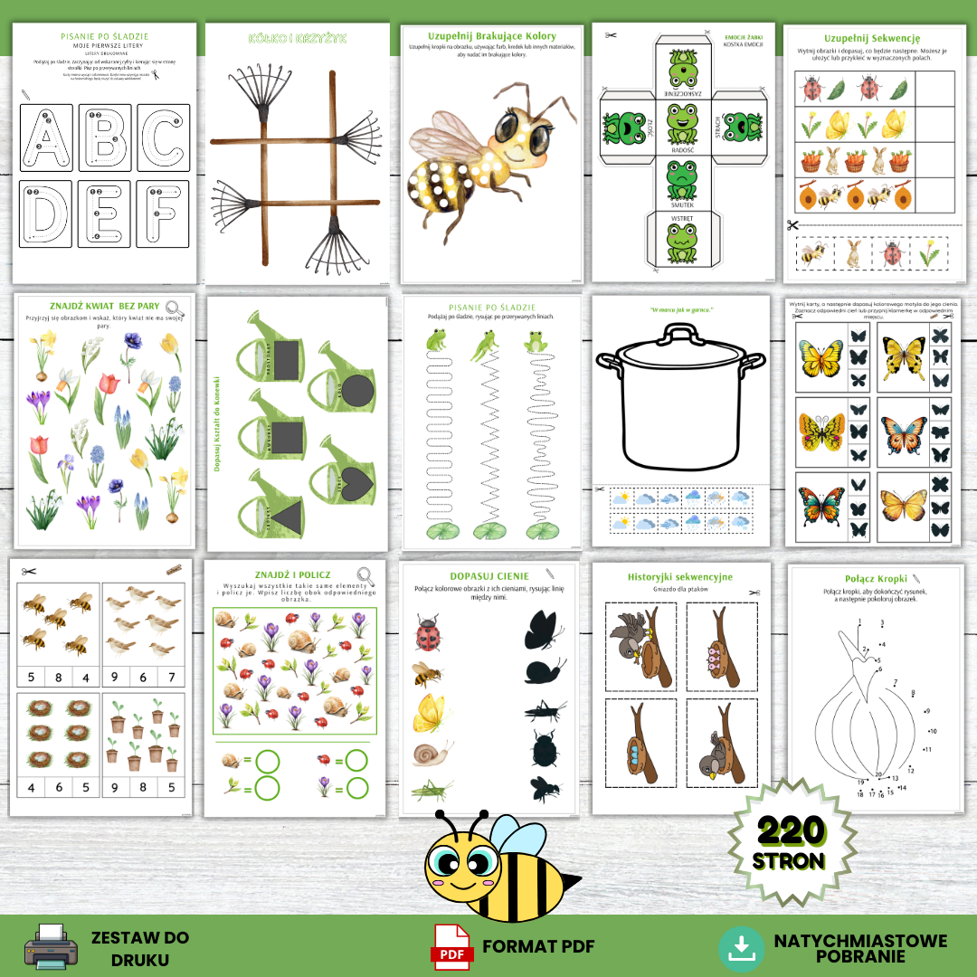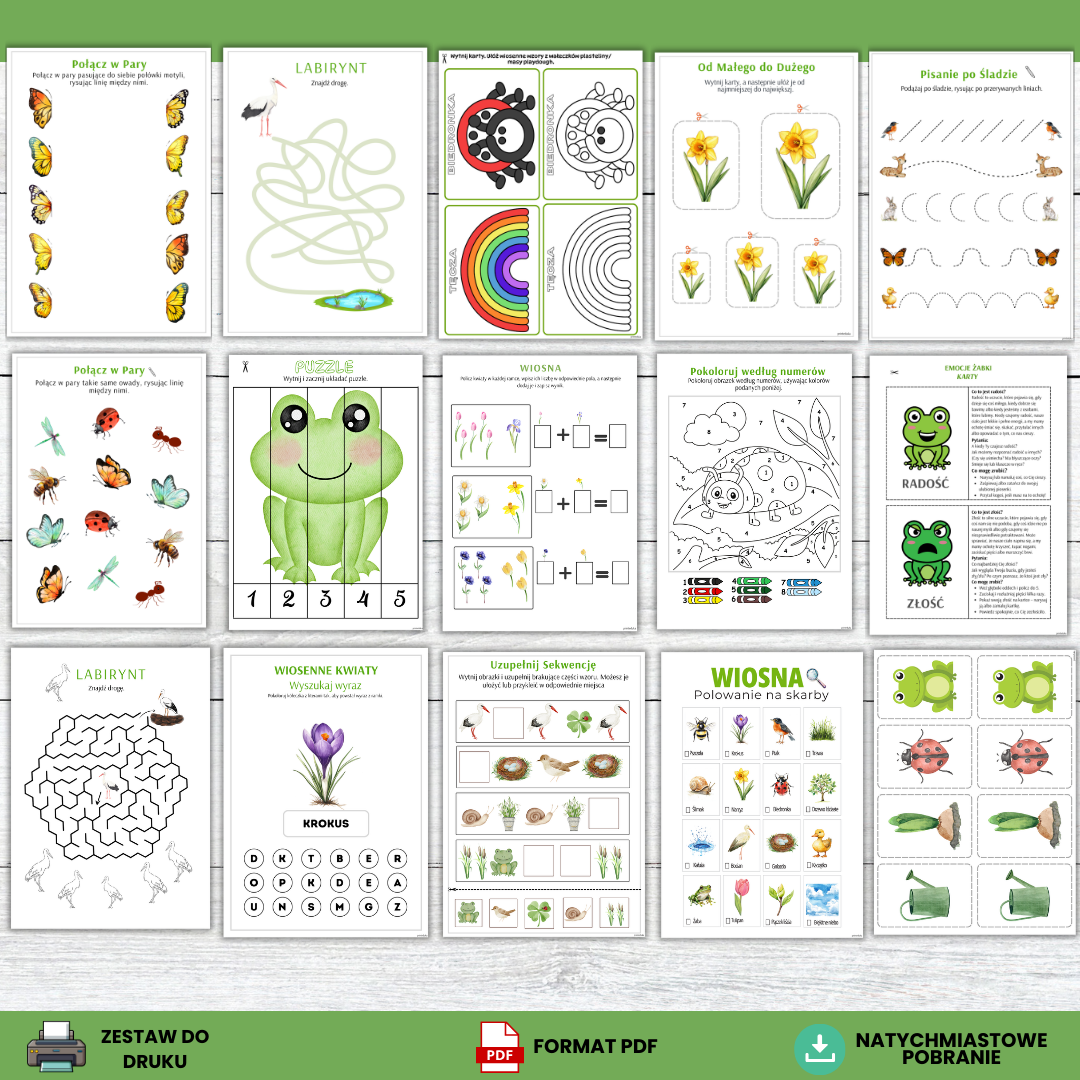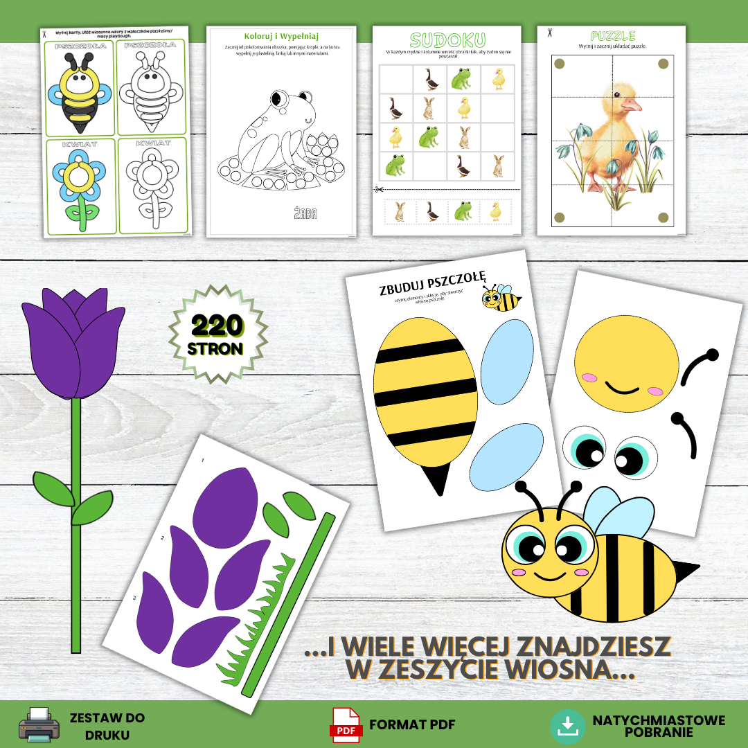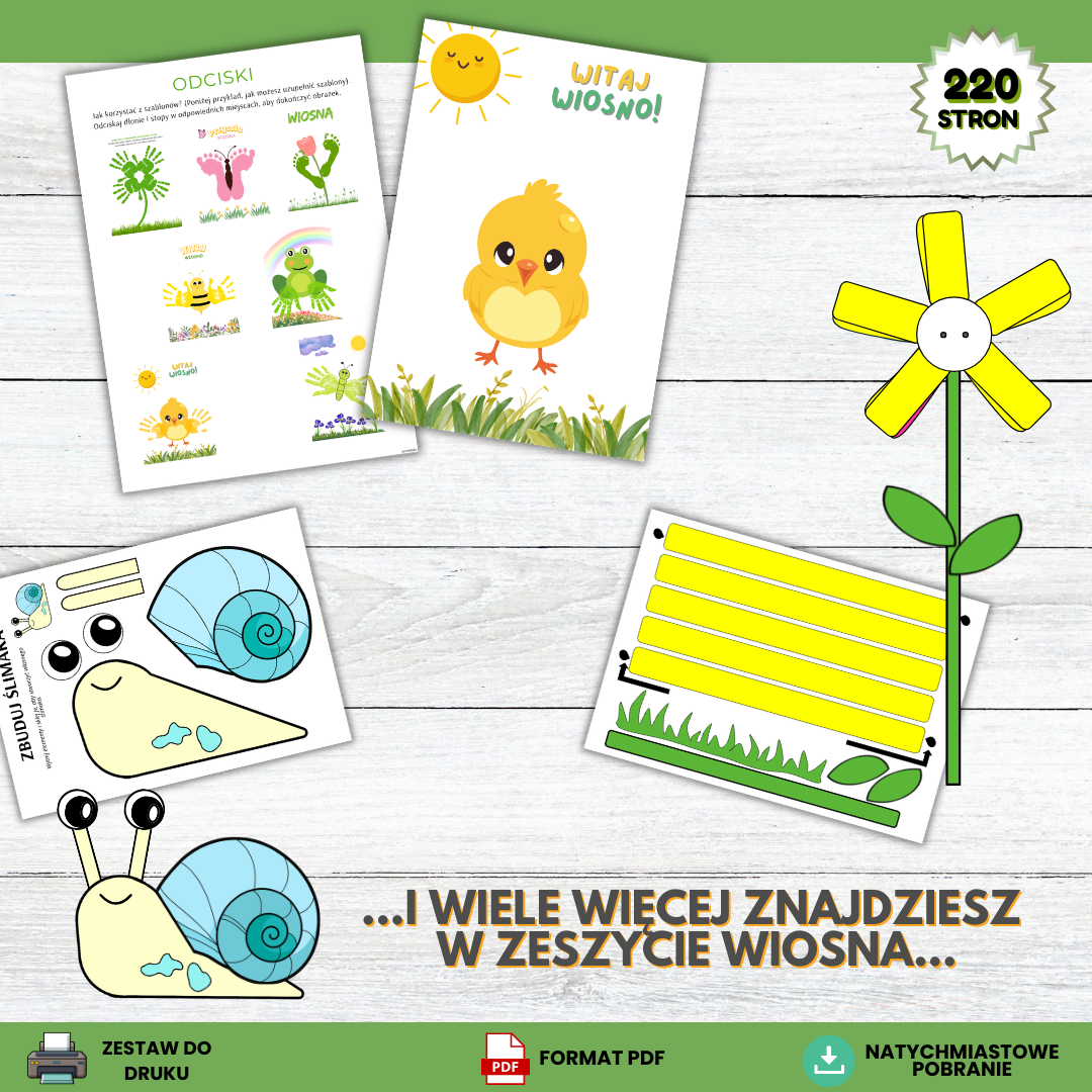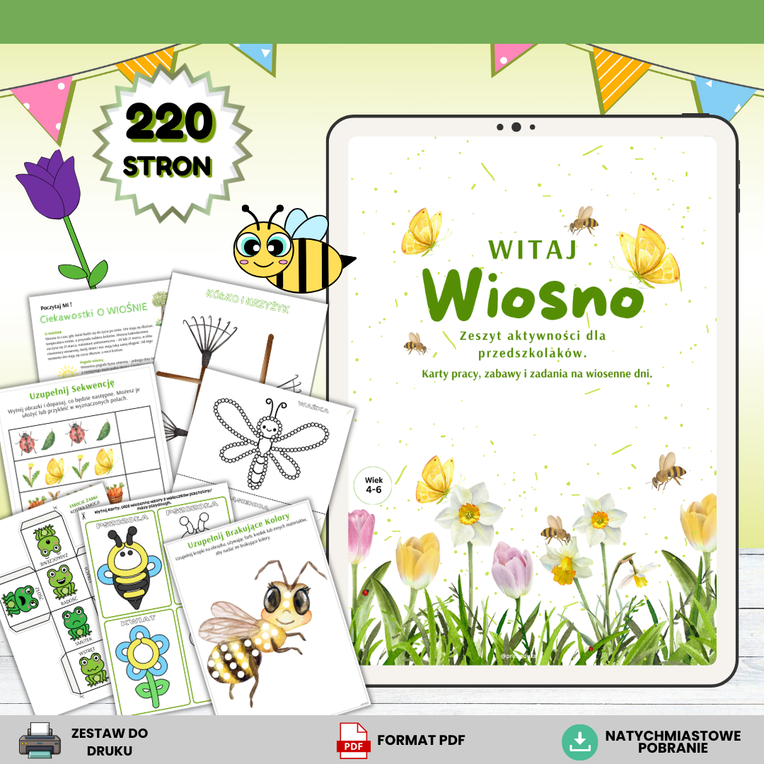 „Witaj Wiosno” – zeszyt aktywności dla przedszkolaków to obszerny zestaw kart pracy, gier oraz kreatywnych zabaw przygotowany z myślą o dzieciach w wieku 4–6 lat. Materiał został stworzony tak, aby łączyć naukę z zabawą i wspierać rozwój dziecka poprzez różnorodne aktywności dostosowane do możliwości przedszkolaków.